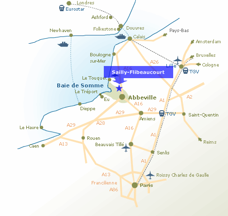 Venir à Sailly-Flibeaucourt A moins de trois heures des grandes villes nord-européennes, la Baie de Somme est facilement accessible en voiture, en train, en avion et même en bateau.